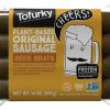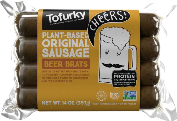 Beer Brats with Microbrewed Fullsail Ale, Vacuum Packed 14 OZ With microbrewed Full Sail ale. Family owned & independent since 1980. Outdoor grill approved. Meat free. Non GMO. Vegan. 50% less fat than typical meat bratwurst (Tofurky Beer Brats (100 g) contain 16 grams fat and 0 mg cholesterol) (Typical meat bratwurst (100 g) contain approx. 28 grams of fat and 65 mg cholesterol). If you're thinking tailgating or backyard grilling, then you're probably thinking beer brat-and do we have the sausage for you! Organic tofu, not soy isolates or powders, fresh onions and garlic, and a great-big hit of microbrewed Full Sail Amber Ale make this brat delicious and satisfying. Who says you need meat to have a party? Check out Tofurky.com for great sausage recipes! Facebook. Vegan. 100% recycled paperboard. Tofurky.com. Made in the USA. Keep refrigerated. Serving Instructions: Grill: (recommended) Lightly rub each sausage with cooking oil and place on heated grill. Cook until hot, turning occasionally. Do not overcook! Sausages only take a short time to heat up on the grill. Or, place sausages on oiled sheet of foil with diced onions, peppers, and 2 tbsp of water or beer; wrap tightly. Throw on grill for 30 minutes, turning occasionally. Microwave: Place sausage on microwaveable plate and cook on high for 30 seconds. Stovetop: Place sausage (whole or chopped) in heated, lightly oiled pan and saute briefly. Add 1 tbsp water after sausage is browned and cook covered for 15 seconds. Or, place sausage in boiling water for 90 seconds. After opening, wrap tightly in plastic bag and refrigerate. Contains: soy, wheat. 14 oz (397 g) PO Box 176 Hood River, OR 97031