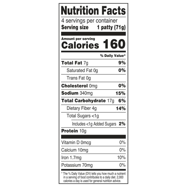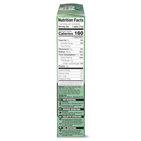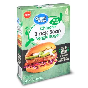 Enjoy a delicious meat-free burger with the Great Value Chipotle Black Bean Veggie Burger. It has 10 grams of protein per serving making this an excellent source of protein. These burgers contain no artificial flavor or colors and no added sugar. With four patties per box, your whole family can enjoy a delicious burger on meatless Mondays or make one throughout the week as an easy, mouthwatering dinner. Whether you’re entirely plant-based or just want to change up your meals, the Great Value Chipotle Black Bean Veggie Burger is a flavorful burger you’re sure to enjoy.