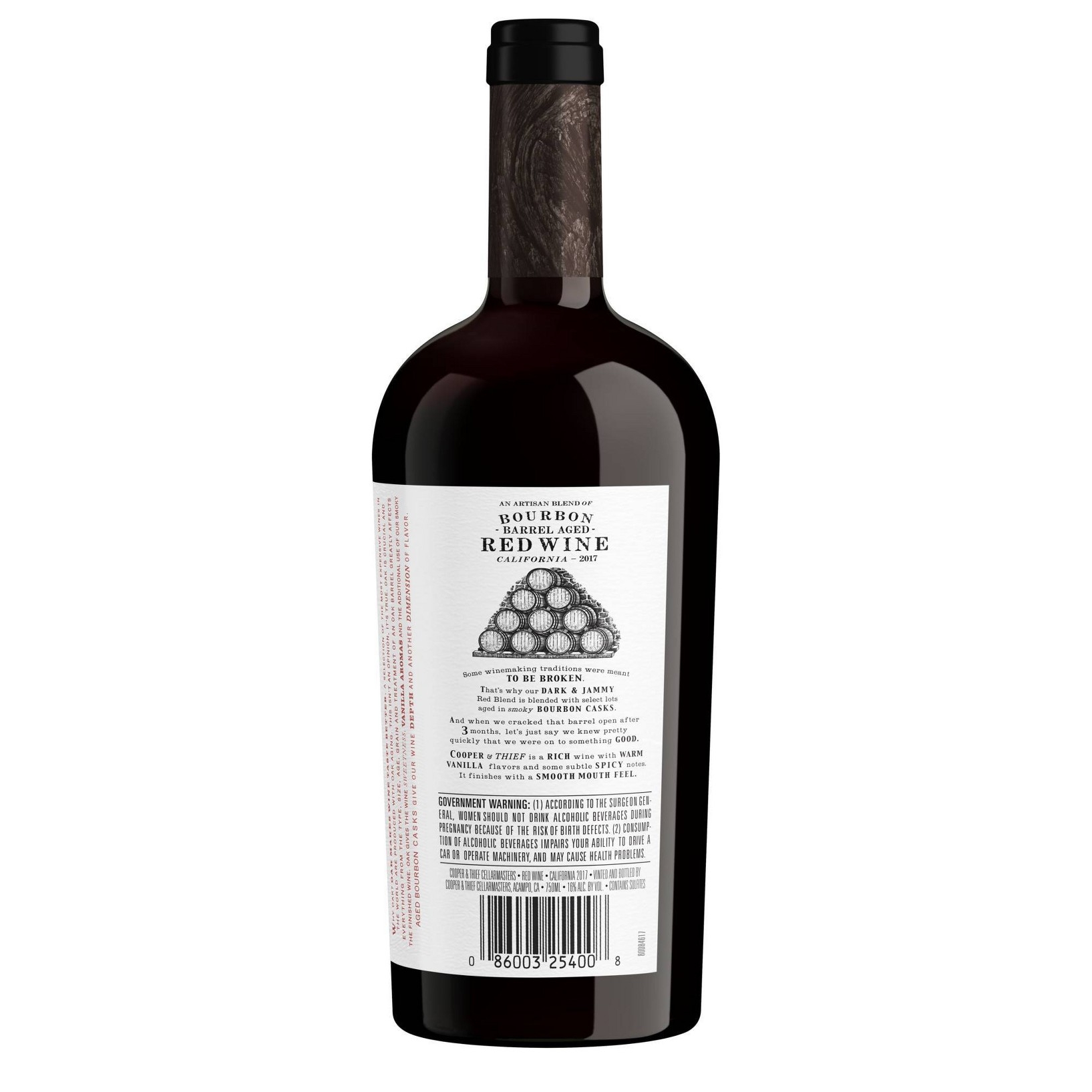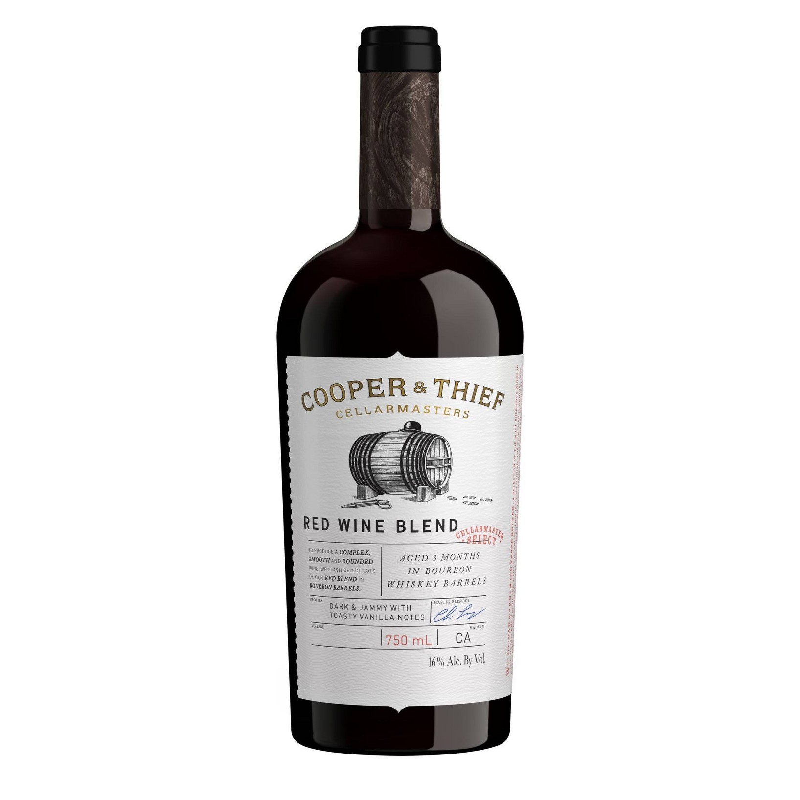 u0026bull;The variety of grapes used in this dark red wine give it hints of dark fruit and toasty vanillau003cbru003eu0026bull;This bourbon barrel aged wine is dark and jammy, loaded with bourbon-inspired flavorsu003cbru003eu0026bull;Three months of barrel aging give this blend its velvety feel and distinct tasteu003cbru003eu0026bull;Cooper and Thief red blend is vibrant enough to be sipped alone or paired with beef, lamb or chickenu003cbru003eu0026bull;Grapes used in this red wine blend are gathered from across California’s winegrowing regionsu003cbru003eu0026bull;Like most red wines, this bottle is best stored at room temperature. Chill shortly before serving