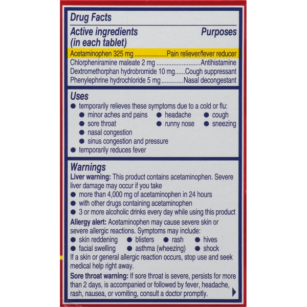 Do not use to sedate children. When using this product do not exceed recommended dosage may cause marked drowsiness avoid alcoholic drinks alcohol, sedatives, and tranquilizers may increase drowsiness. If pregnant or breast-feeding, ask a health professional before use. Keep out of reach of children. In case of overdose, get medical help or contact a Poison Control Center right away. Quick medical attention is critical for adults as well as for children even if you do not notice any signs or symptoms. Ask a doctor before use if you have liver disease heart disease diabetes high blood pressure glaucoma thyroid disease cough with excessive phlegm (mucus) a breathing problem such as emphysema or chronic bronchitis difficulty in urination due to enlargement of the prostate gland persistent or chronic cough such as occurs with smoking, asthma, or emphysema a sodium restricted diet. Ask a doctor or pharmacist before use if you are taking the blood thinning drug warfarin taking sedatives or tranquilizers. Do not use with any other drug containing acetaminophen (prescription or nonprescription). If you are not sure whether a drug contains acetaminophen, ask a doctor or pharmacist. if you are now taking a prescription monoamine oxidase inhibitor (MAOI) (certain drugs for depression, psychiatric, or emotional conditions, or Parkinson’s disease), or for 2 weeks after stopping the MAOI drug. If you do not know if your prescription drug contains an MAOI, ask a doctor or pharmacist before taking this product. if you have ever had an allergic reaction to this product or any of its ingredients in children under 12 years of age. be careful when driving a motor vehicle or operating machinery excitability may occur, especially in children. Stop use and ask a doctor if pain, cough, or nasal congestion gets worse or lasts more than 7 days fever gets worse or lasts more than 3 days redness or swelling is present new symptoms occur cough comes back or occurs with rash or headache that lasts. These could be signs of a serious condition. nervousness, dizziness, or sleeplessness occurs. Liver warning: This product contains acetaminophen. Severe liver damage may occur if you take more than 4,000 mg of acetaminophen in 24 hours with other drugs containing acetaminophen 3 or more alcoholic drinks every day while using this product Allergy alert: Acetaminophen may cause severe skin or severe allergic reactions. Symptoms may include: skin reddening facial swelling blisters rash asthma (wheezing) hives shock If a skin or general allergic reaction occurs, stop use and seek medical help right away. Sore throat warning: If sore throat is severe, persists for more than 2 days, is accompanied or followed by fever, headache, rash, nausea, or vomiting, consult a doctor promptly.