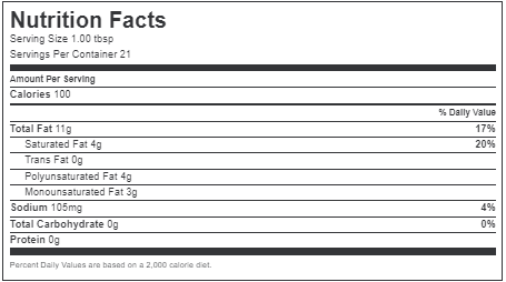 Each tablespoon contains 40% less saturated fat than a tablespoon of dairy butter, free from any artificial flavors, kosher certified and 100% gluten and dairy free.