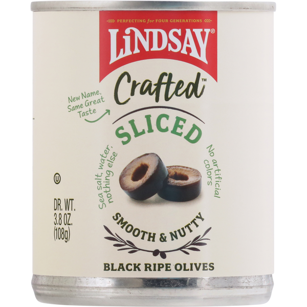 Smooth & nutty. No artificial flavors. Gluten free. Cholesterol free. Non GMO Project verified. nongmoproject.org. Perfecting for four generations. New name same great taste. Sea salt, water, nothing else. No artificial color. Unmatched Quality & Taste: The Lindsay gold standard. Est. 1916. Snack naturally. Nothing average about these ripe olives. Simply crafted with no artificial colors and flavors, their delicate texture and nutty flavor work wonders in elevating any meal. Made with sea salt. No artificial colors. No major allergens. Olives contain naturally occurring oil which may appear on the fruit or the brine. ilovelindsay.com. Facebook. Instagram. Pinterest. Question, comments? Visit ilovelindsay.com or call 1-800-252-3557. BPA-free lining. Please recycle.