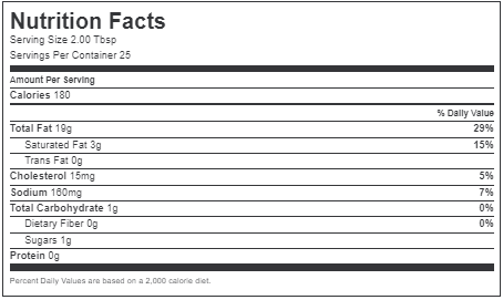 Ingredients: Soybean Oil, Cultured Nonfat Buttermilk, Egg Yolks, Water, Contains Less Than 2% Of Distilled Vinegar, Spices, Salt, Sugar, Onion*, Garlic*, Xanthan Gum, Parsley*.