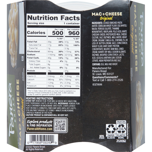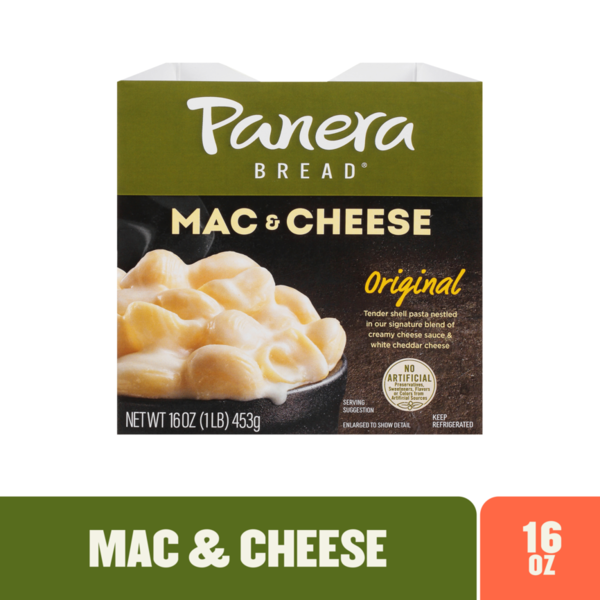 Panera Mac & Cheese offers a bakery-inspired microwave meal that is perfect to enjoy at your convenience. This single serve mac and cheese is made with a creamy blend of cheeses, including tangy white cheddar, perfectly nestled in uniquely shaped, tender pipette rigate pasta. Panera mac and cheese is a go-to classic that you can enjoy as a quick lunch meal or single serve microwave dinner. Made with no artificial preservatives, sweeteners, flavors or colors from artificial sources, this packaged meal is also vegetarian. With tasty lunch snacks and microwave meals, Panera helps you spend less time in the kitchen, and more time enjoying a delicious microwave mac and cheese dinner. You can cook this lunch on the go in the microwave for 3 to 4 minutes, or on the stovetop to 165 degrees F without letting it boil. Store these microwavable meals in the refrigerator to maintain their freshness. Make easy, craveable meals with help from Panera Bread at home.