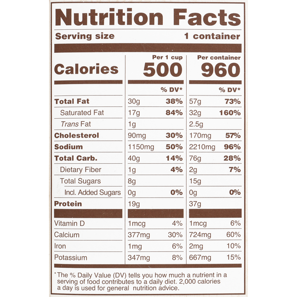 Heating Instructions: Stove Top: Remove film. Pour mac & cheese into sauce pan. Heat thoroughly (165 degrees F). Do not boil. Microwave: Remove film. Place container on microwave-safe plate, cover loosely. Heat on high 3-4 minutes (times may vary) until hot 165 degrees F), stir halfway through. Let stand 1 minute in microwave. Carefully remove by the plate. Caution! Product & container will be very hot.