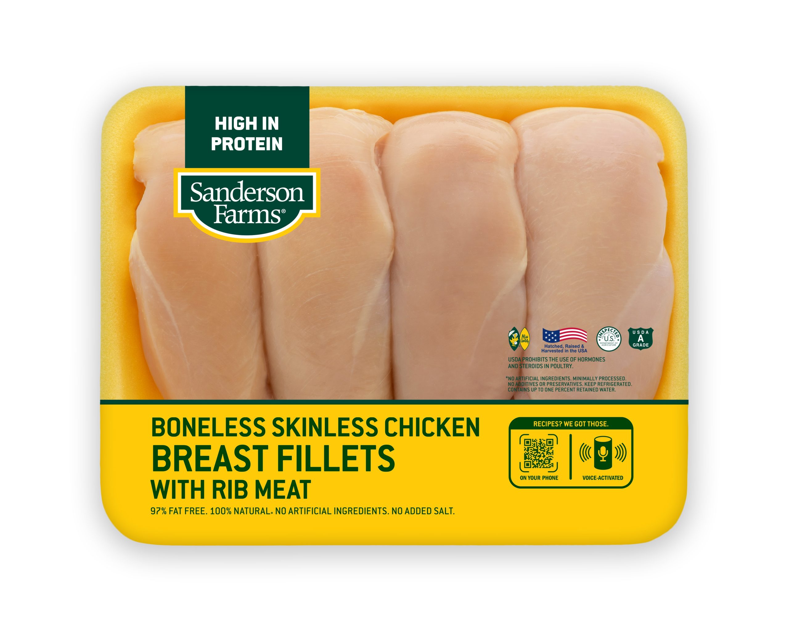 Sanderson Farms family pack of boneless, skinless breast fillets with rib meat is ready to serve at any occasion! Just pair with any of our great recipes and you’ll have a delicious meal in no time! For cooking inspiration, check out our recipes from the QR code on front of the package, our voice-activated recipes from your smart speaker, or on sandersonfarms.com.