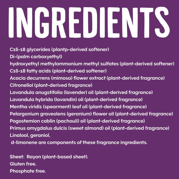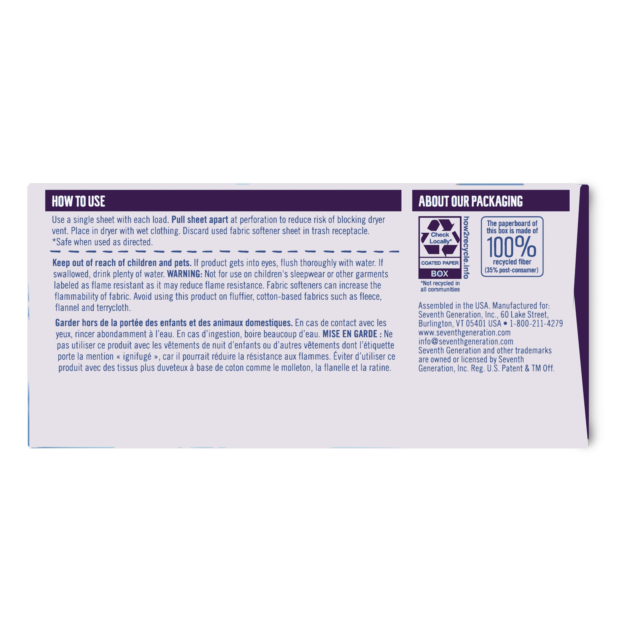 Seventh Generation’s Fresh Lavender Scented Fabric Softener Sheets leave your clothes feeling soft and smelling great. Our dryer sheets use essential oils and botanical ingredients for a refreshing scent—not overpowering. We’ve re-designed our sheets for softer clothes and less static, but still make them with 97% plant-based ingredients and without synthetic fragrances because we believe it’s a great way to care for your family. Not only that, but we also believe you deserve to know what’s in the products you buy, so we list our ingredients—right on the package. At Seventh Generation, we do business differently. We believe our products are healthy solutions for use within your home–and for the community and environment outside it. We are always evaluating how to reduce their environmental impact, increase performance and safety, and create a more sustainable supply chain. Furthermore, we believe it is our responsibility to set a course for a more mindful way of doing business, where companies act as partners with other stakeholders to create a brighter future for the whole planet. Seventh Generation is proud to be a Certified B Corporation. B Corps are certified to be better for workers, better for communities, and better for the environment. By choosing Seventh Generation laundry soap products, you’re joining us in nurturing the health of the next seven generations.
