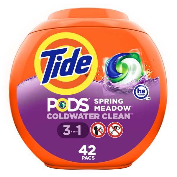 Tide PODS laundry detergent pacs offer surprisingly powerful clean in 1 step. Combining super concentrated detergent, extra odor fighters, and extra stain removers, each capsule cleans, freshens, and rejuvenates clothes for brighter brights and whiter whites. Small yet powerful, Tide PODS deliver cleaning power in a convenient, pre-measured unit dose form. Also, thanks to the special film and HE Turbo technology with quick-collapsing suds, the capsules dissolve completely in all temperatures and do not produce excess suds. The Spring Meadow scent is infused with with fresh floral notes to help keep your clothes smelling great. More than just a liquid in a pouch, Tide PODS delivers a surprisingly powerful clean in 1 step.